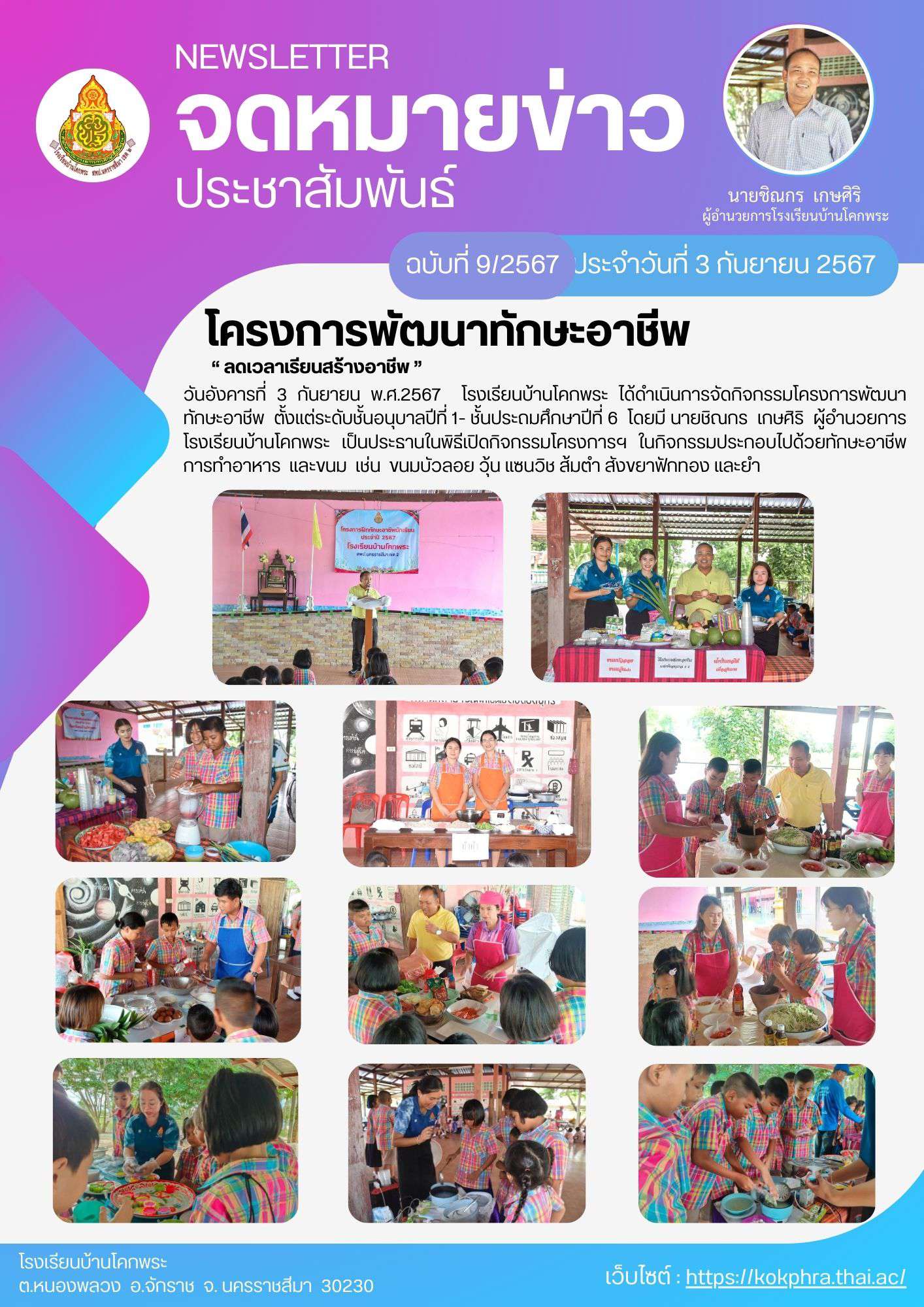 วันอังคารที่ 3 กันยายน พ.ศ.2567 โรงเรียนบ้านโคกพระ ได้ดำเนินการจัดกิจกรรมโครงการพัฒนาทักษะอาชีพ ตั้งแต่ระดับชั้นอนุบาลปีที่ 1- ชั้นประถมศึกษาปีที่ 6 โดยมี นายชิณกร เกษศิริ ผู้อำนวยการโรงเรียนบ้านโคกพระ เป็นประธานในพิธีเปิดกิจกรรมโครงการฯ ในกิจกรรมประกอบไปด้วยทักษะอาชีพการทำอาหาร และขนม เช่น ขนมบัวลอย วุ้น แซนวิช ส้มตำ สังขยาฟักทอง และยำ
