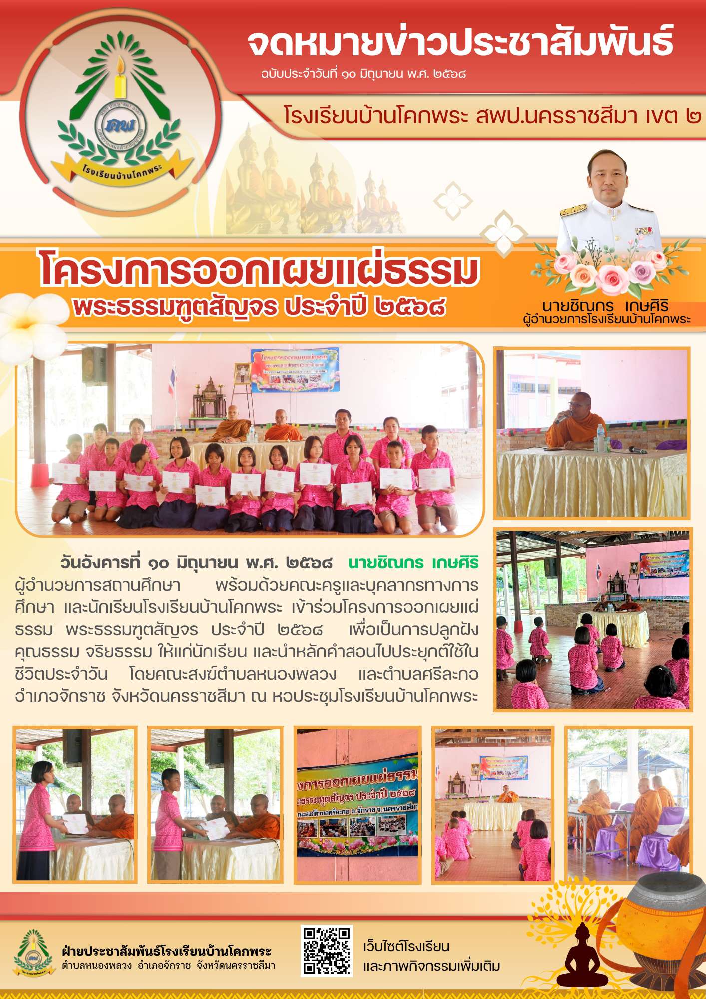 วันอังคารที่ ๑๐ มิถุนายน พ.ศ. ๒๕๖๘ นายชิณกร เกษศิริ ผู้อำนวยการสถานศึกษา พร้อมด้วยคณะครูและบุคลากรทางการศึกษา และนักเรียนโรงเรียนบ้านโคกพระ เข้าร่วมโครงการออกเผยแผ่ธรรม พระธรรมฑูตสัญจร ประจำปี ๒๕๖๘ เพื่อเป็นการปลูกฝังคุณธรรม จริยธรรม ให้แก่นักเรียน และนำหลักคำสอนไปประยุกต์ใช้ในชีวิตประจำวัน โดยคณะสงฆ์ตำบลหนองพลวง และตำบลศรีละกอ อำเภอจักราช จังหวัดนครราชสีมา ณ หอประชุมโรงเรียนบ้านโคกพระ