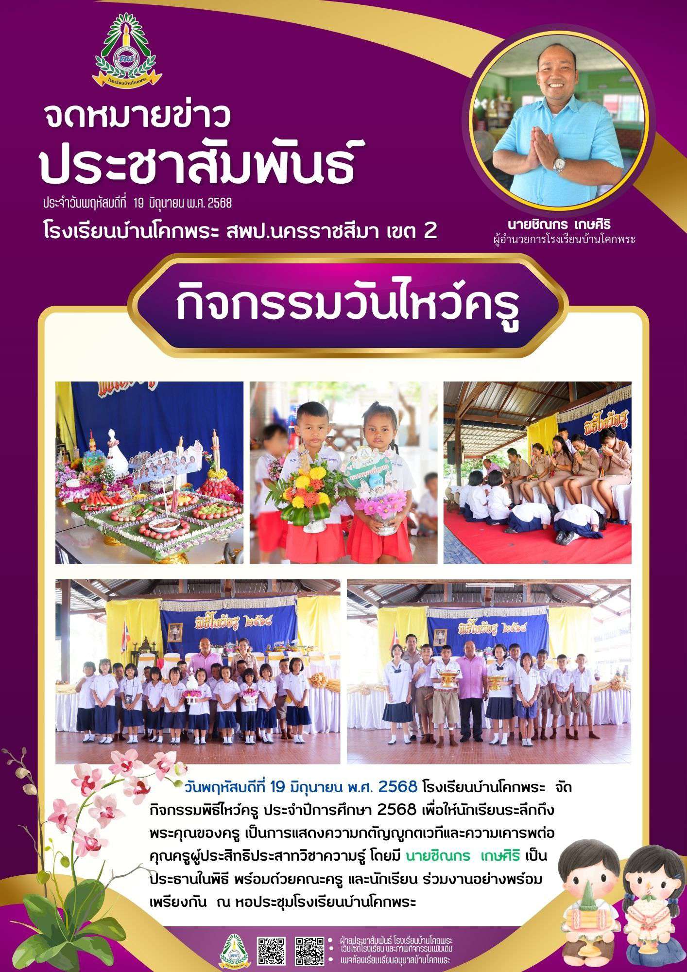 วันพฤหัสบดีที่ 19 มิถุนายน 2568 โรงเรียนหบ้านโคกพระ จัดกิจกรรมพิธีไหว้ครู ประจำปีการศึกษา 2568 เพื่อให้นักเรียนระลึกถึงพระคุณของครู เป็นการแสดงความกตัญญูกตเวทีและความเคารพต่อคุณครูผู้ประสิทธิประสาทวิชาความรู้ โดยมี นายชิณกร เกษศิริ เป็นประธานในพิธี พร้อมด้วยคณะครู และนักเรียน ร่วมงานอย่างพร้อมเพรียงกัน ณ หอประชุมโรงเรียนบ้านโคกพระ