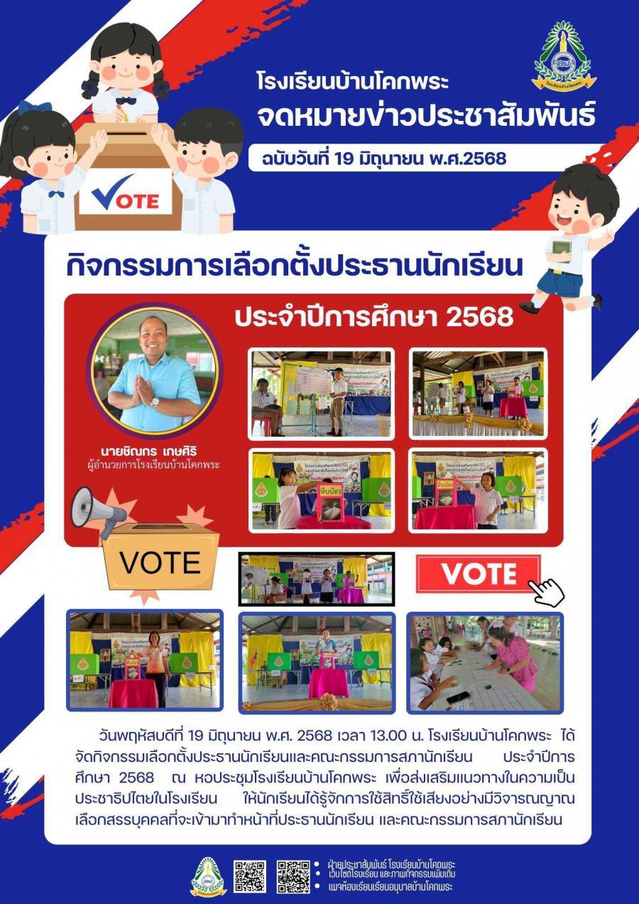 วันพฤหัสบดีที่ 19 มิถุนายน พ.ศ. 2568 เวลา 13.00 น. โรงเรียนบ้านโคกพระ ได้จัดกิจกรรมเลือกตั้งประธานนักเรียนและคณะกรรมการสภานักเรียน ประจำปีการศึกษา 2568 ณ หอประชุมโรงเรียนบ้านโคกพระ เพื่อส่งเสริมแนวทางในความเป็นประชาธิปไตยในโรงเรียน ให้นักเรียนได้รู้จักการใช้สิทธิ์ใช้เสียงอย่างมีวิจารณญาณ เลือกสรรบุคคลที่จะเข้ามาทำหน้าที่ประธานนักเรียน และคณะกรรมการสภานักเรียน
