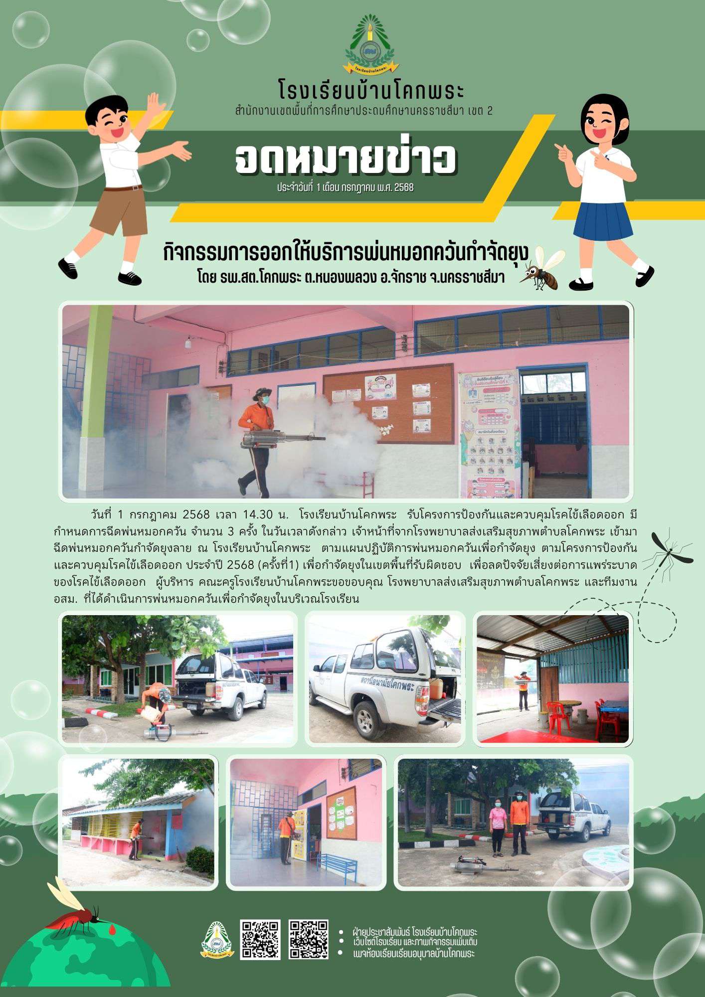 วันที่ 1 กรกฎาคม 2568 เวลา 14.30 น. โรงเรียนบ้านโคกพระ รับโครงการป้องกันและควบคุมโรคไข้เลือดออก มีกำหนดการฉีดพ่นหมอกควัน จำนวน 3 ครั้ง ในวันเวลาดังกล่าว เจ้าหน้าที่จากโรงพยาบาลส่งเสริมสุขภาพตำบลโคกพระ เข้ามาฉีดพ่นหมอกควันกำจัดยุงลาย ณ โรงเรียนบ้านโคกพระ ตามแผนปฏิบัติการพ่นหมอกควันเพื่อกำจัดยุง ตามโครงการป้องกันและควบคุมโรคไข้เลือดออก ประจำปี 2568 (ครั้งที่1) เพื่อกำจัดยุงในเขตพื้นที่รับผิดชอบ เพื่อลดปัจจัยเสี่ยงต่อการแพร่ระบาดของโรคไข้เลือดออก ผู้บริหาร คณะครูโรงเรียนบ้านโคกพระขอขอบคุณ โรงพยาบาลส่งเสริมสุขภาพตำบลโคกพระ และทีมงาน อสม. ที่ได้ดำเนินการพ่นหมอกควันเพื่อกำจัดยุงในบริเวณโรงเรียน