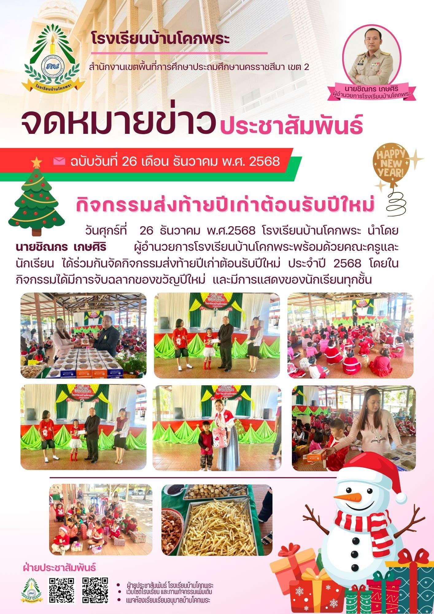 วันศุกร์ที่ 26 ธันวาคม พ.ศ.2568 โรงเรียนบ้านโคกพระ นำโดย นายชิณกร เกษศิริ ผู้อำนวยการโรงเรียนบ้านโคกพระพร้อมด้วยคณะครูและนักเรียน ได้ร่วมกันจัดกิจกรรมส่งท้ายปีเก่าต้อนรับปีใหม่ ประจำปี 2568 โดยในกิจกรรมได้มีการจับฉลากของขวัญปีใหม่ และมีการแสดงของนักเรียนทุกชั้น